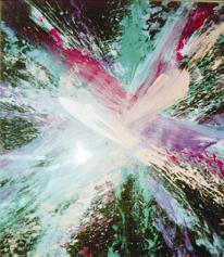 Star Struck Acrylics on Masonite 22” x 28” $600 The black background was painted in first. Vibrant colors of aqua, red, purple and white were applied with swinging strokes. |